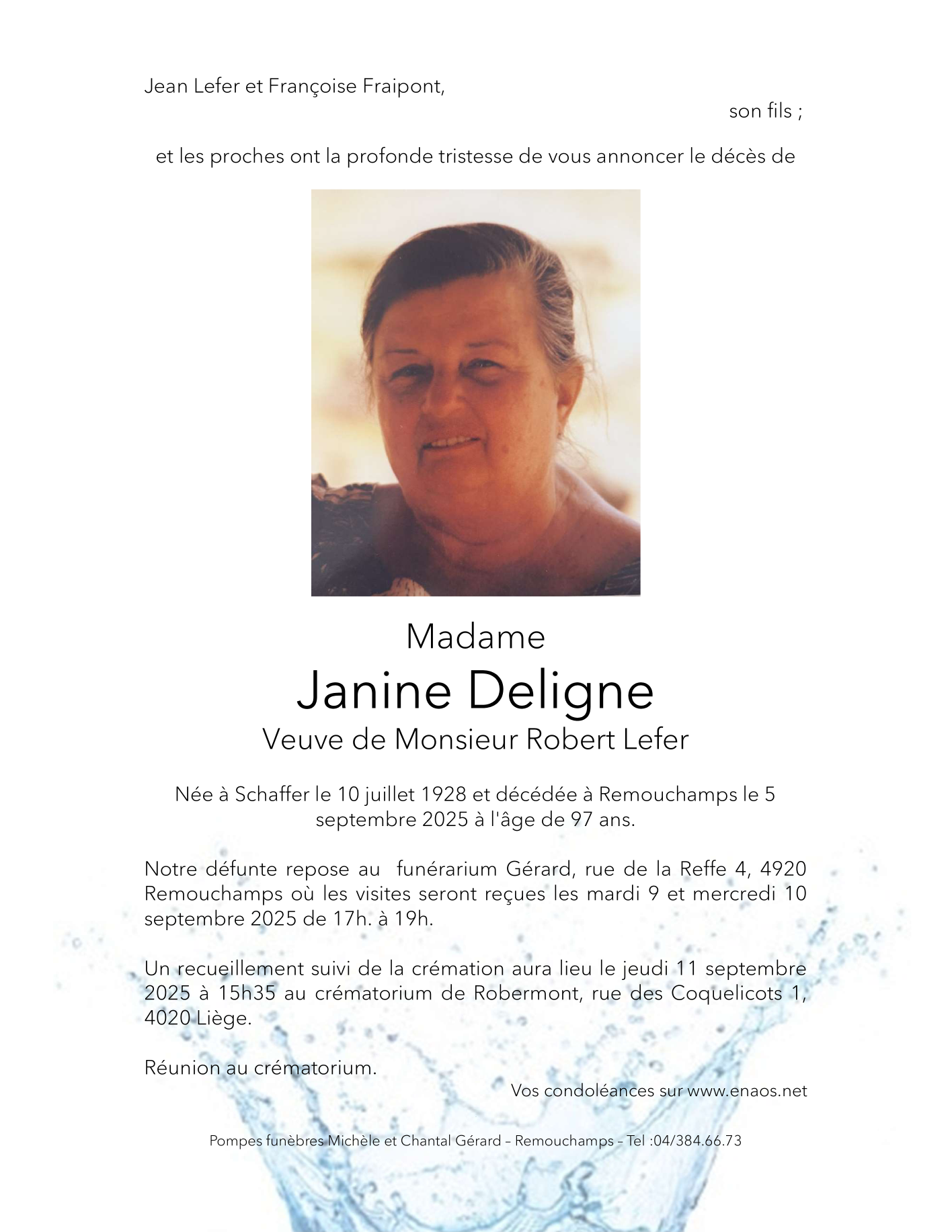 Décédée à Aywaille (4920) le vendredi 5 septembre 2025 à l'âge de 97 ans