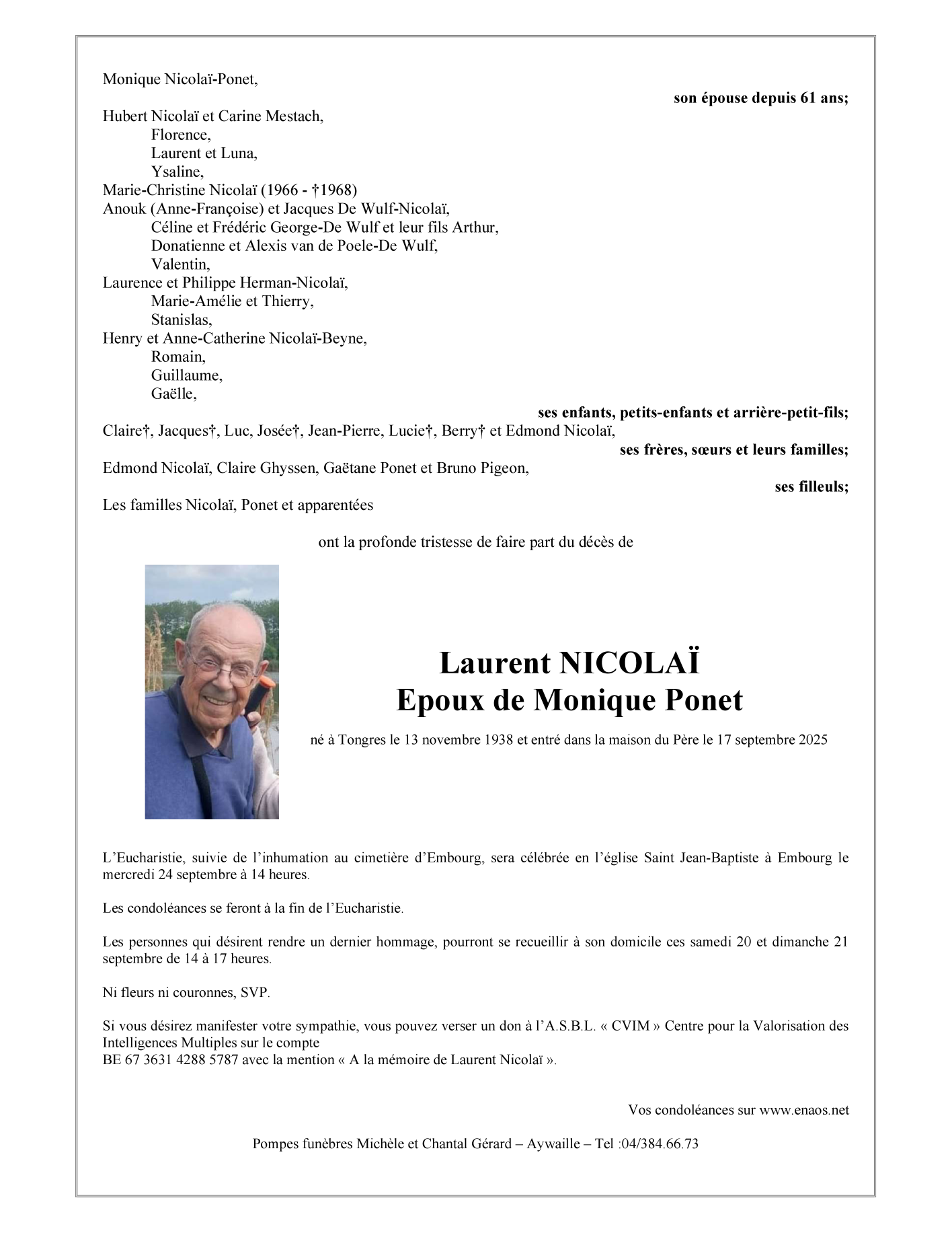 Décédé à Embourg (4053) le mercredi 17 septembre 2025 à l'âge de 86 ans