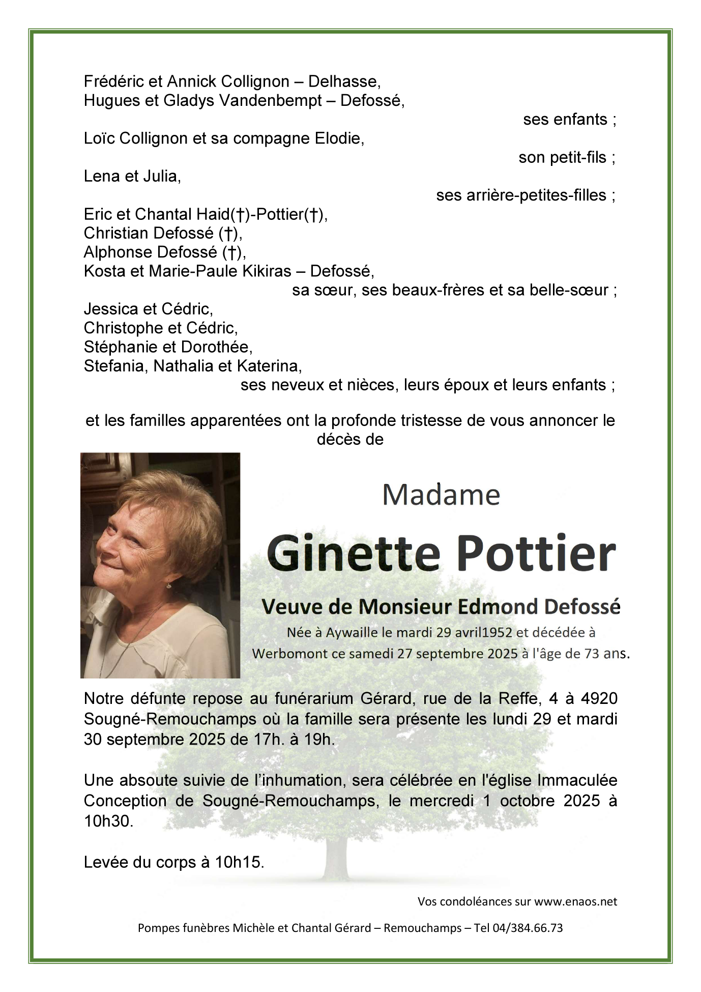 Décédée à Ferrières (4190) le samedi 27 septembre 2025 à l'âge de 73 ans