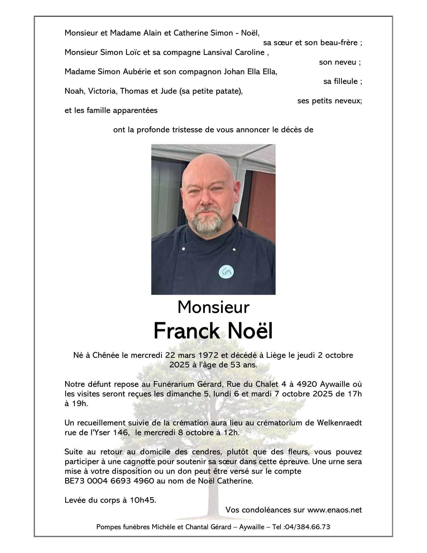 Décédé à Liège (4000) le jeudi 2 octobre 2025 à l'âge de 53 ans