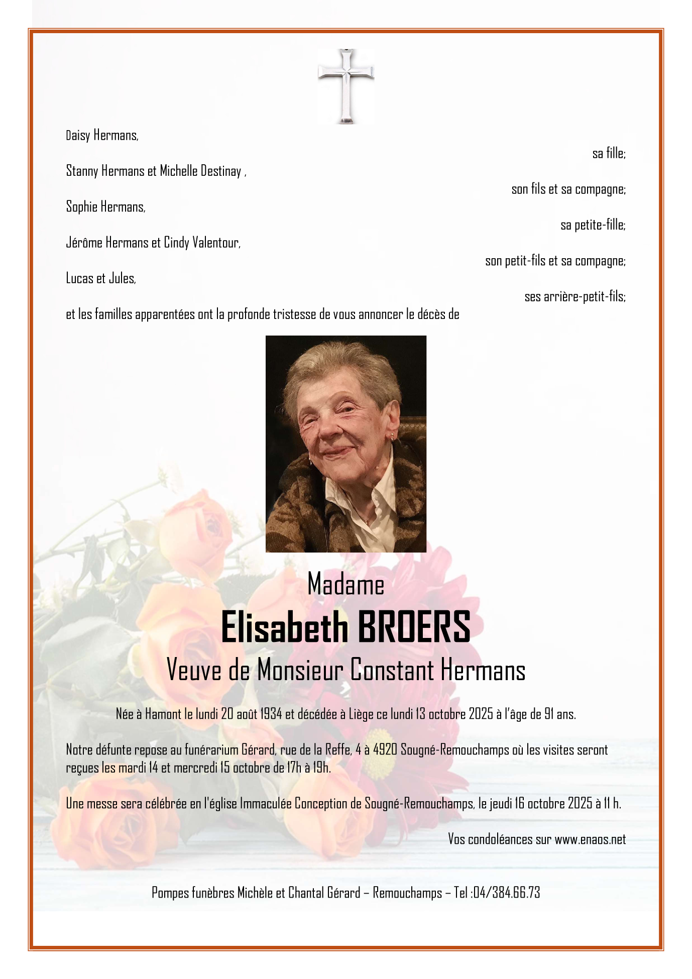 Décédée à Liège (4000) le lundi 13 octobre 2025 à l'âge de 91 ans