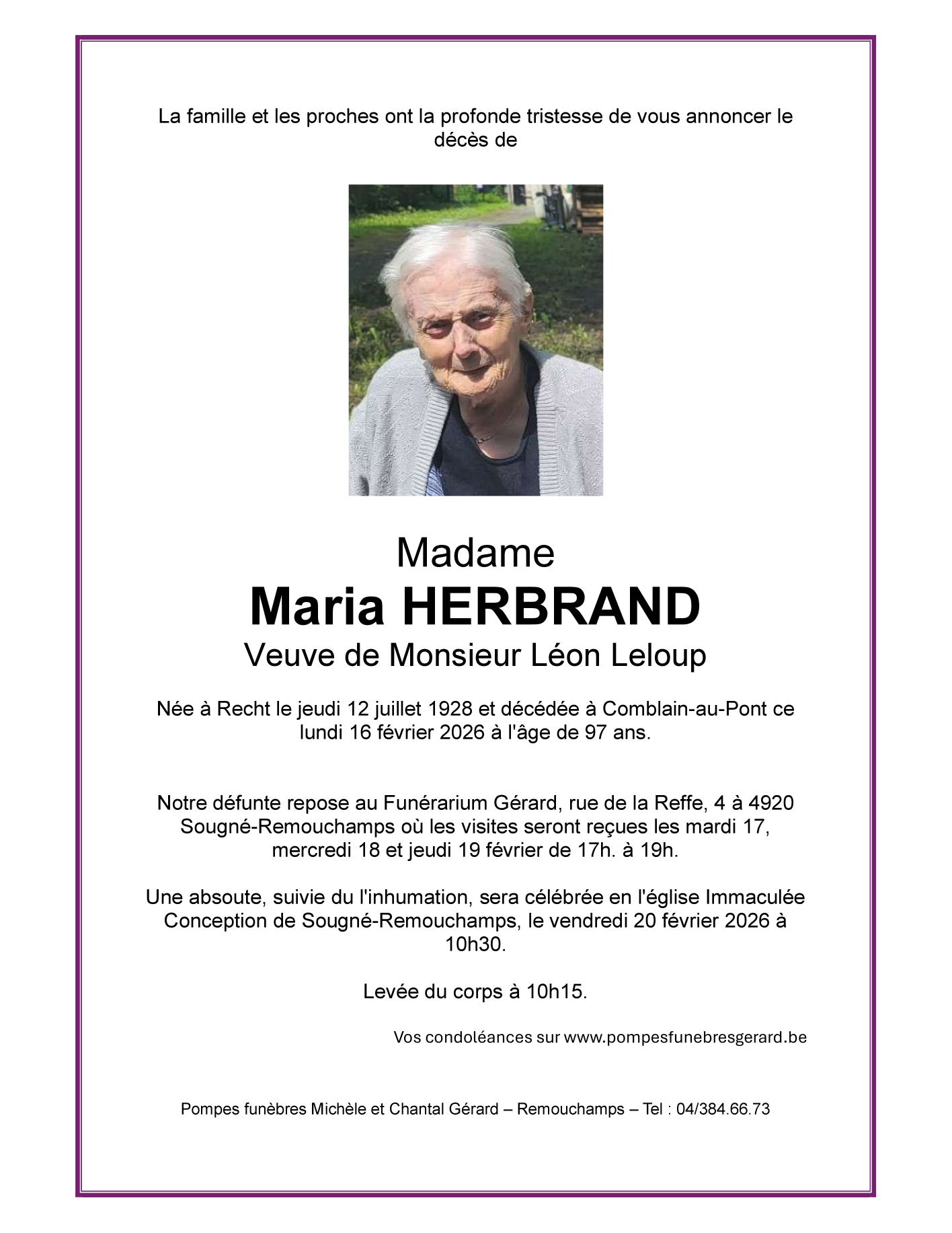 Décédée à Comblain-au-Pont (4170) le lundi 16 février 2026 à l'âge de 97 ans