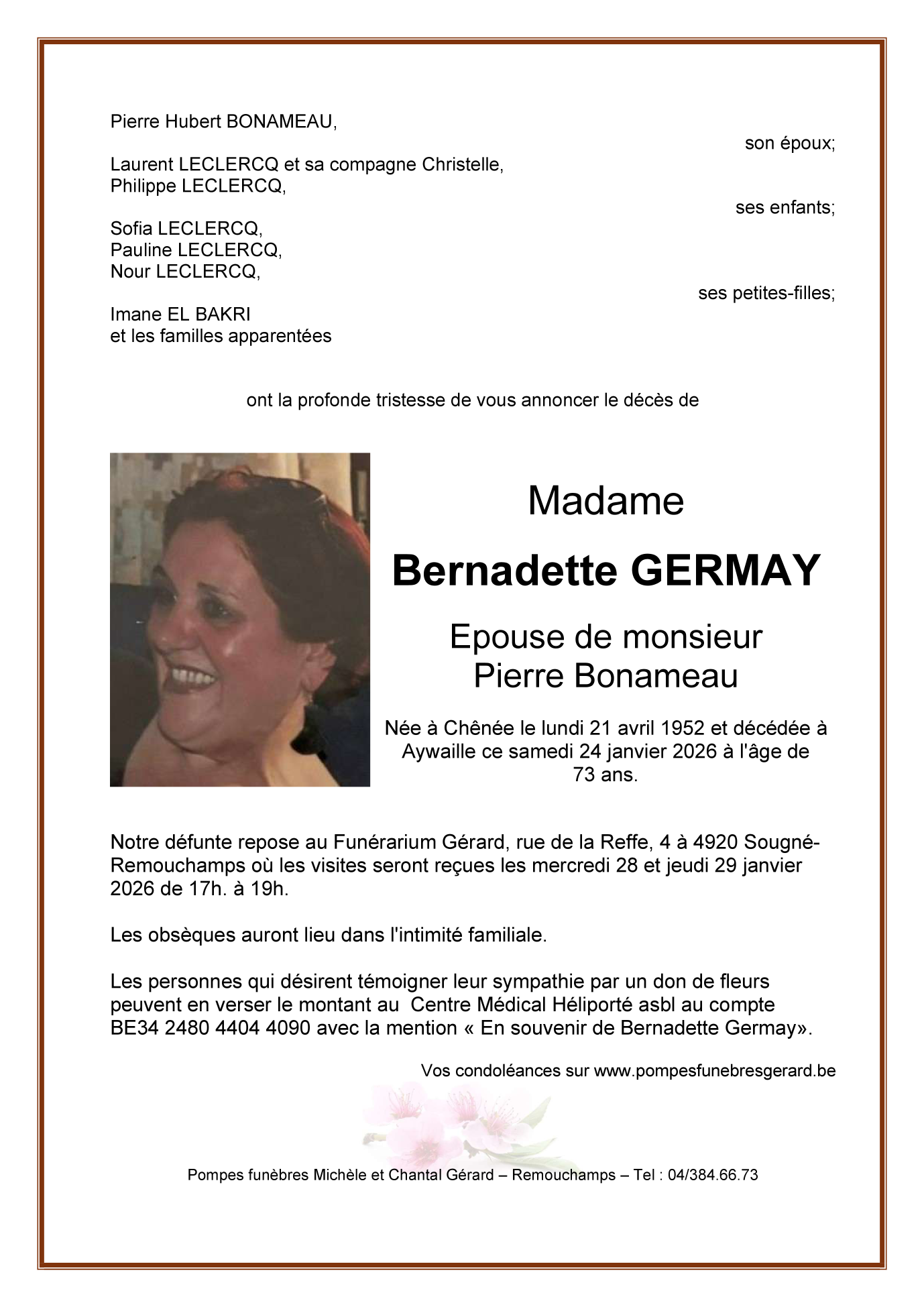 Décédée à Aywaille (4920) le samedi 24 janvier 2026 à l'âge de 73 ans
