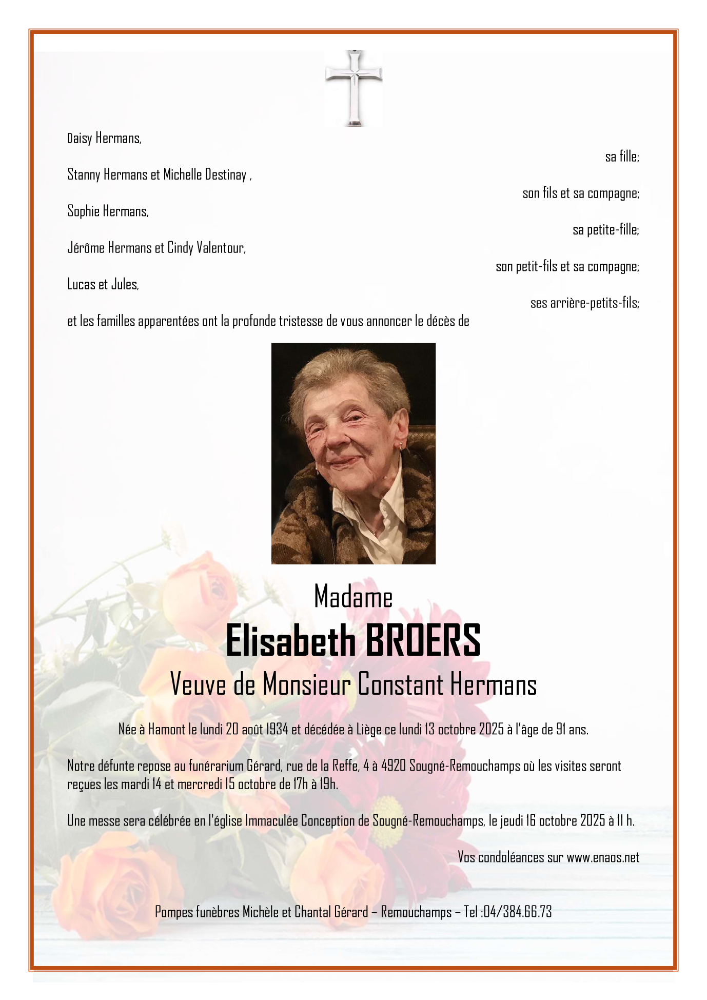 Décédée à Liège (4000) le lundi 13 octobre 2025 à l'âge de 91 ans
