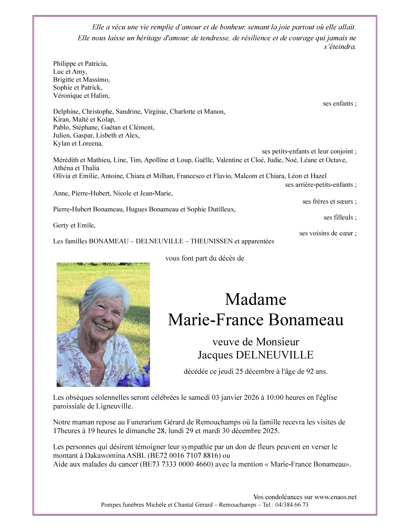 Décédée à Beaufays (4052) le jeudi 25 décembre 2025 à l'âge de 92 ans