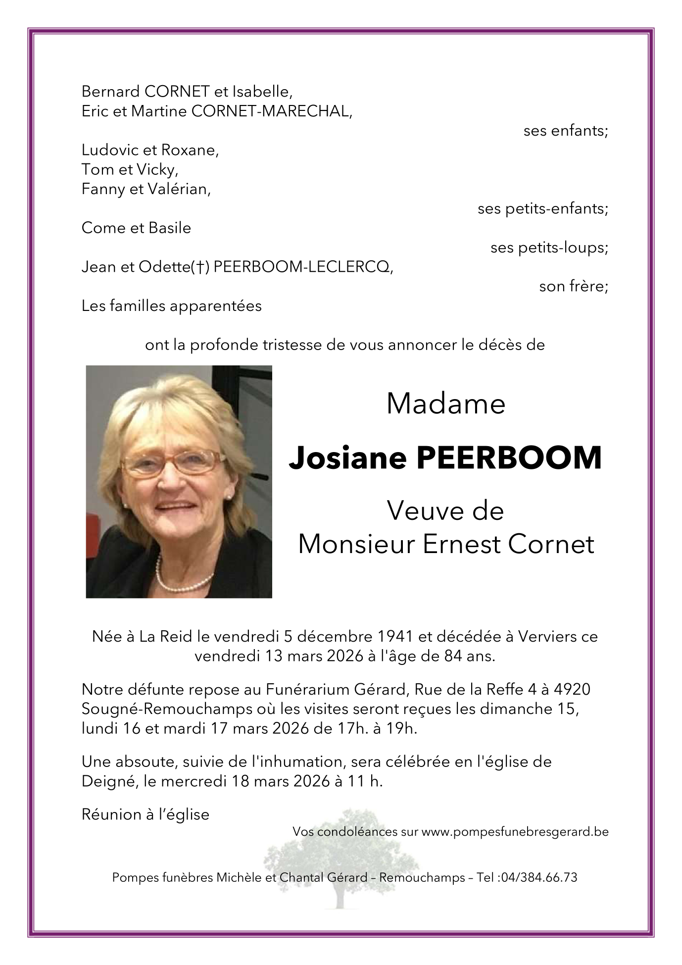 Décédée à Verviers (4800) le vendredi 13 mars 2026 à l'âge de 84 ans