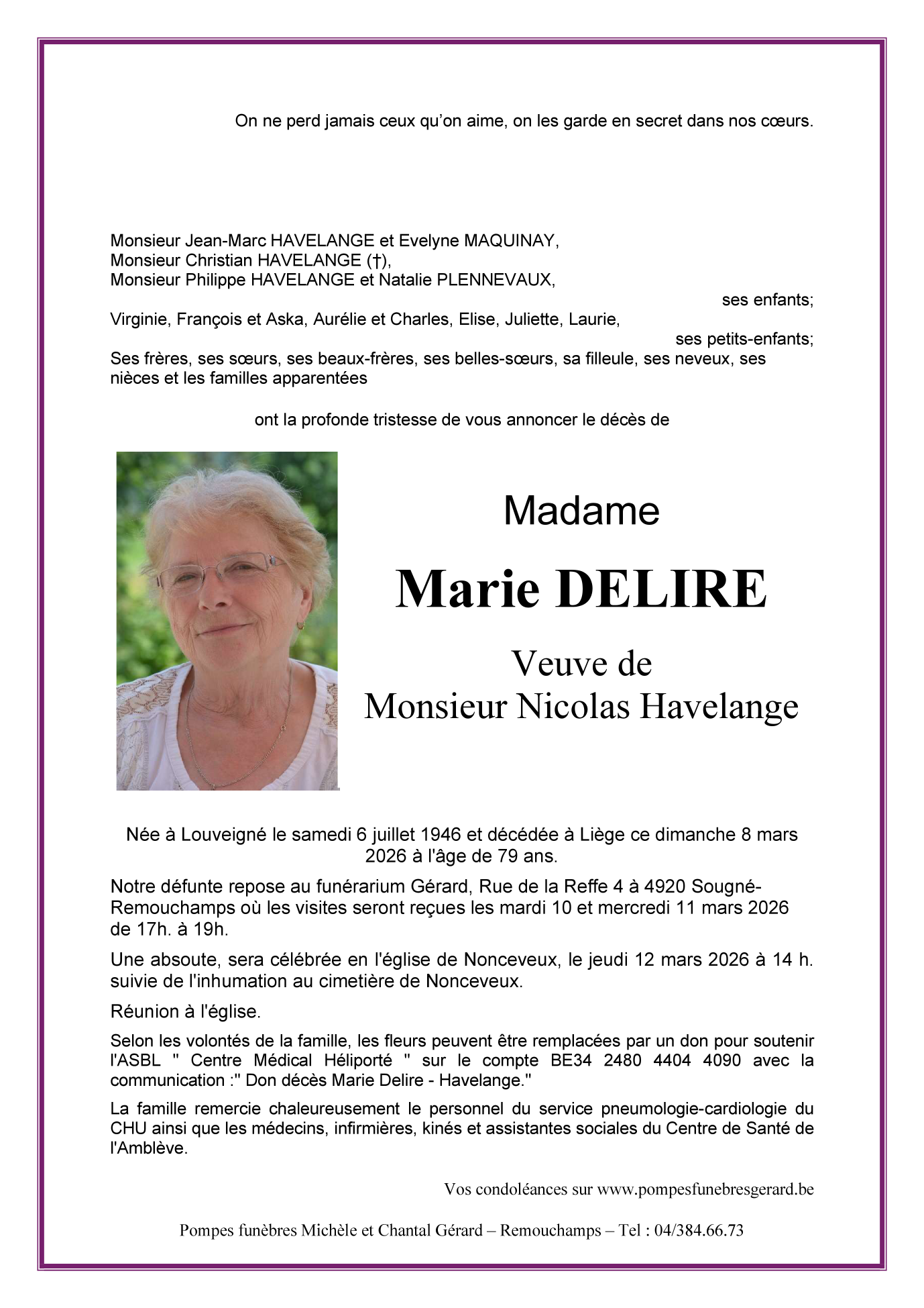 Décédée à Liège (4000) le dimanche 8 mars 2026 à l'âge de 79 ans
