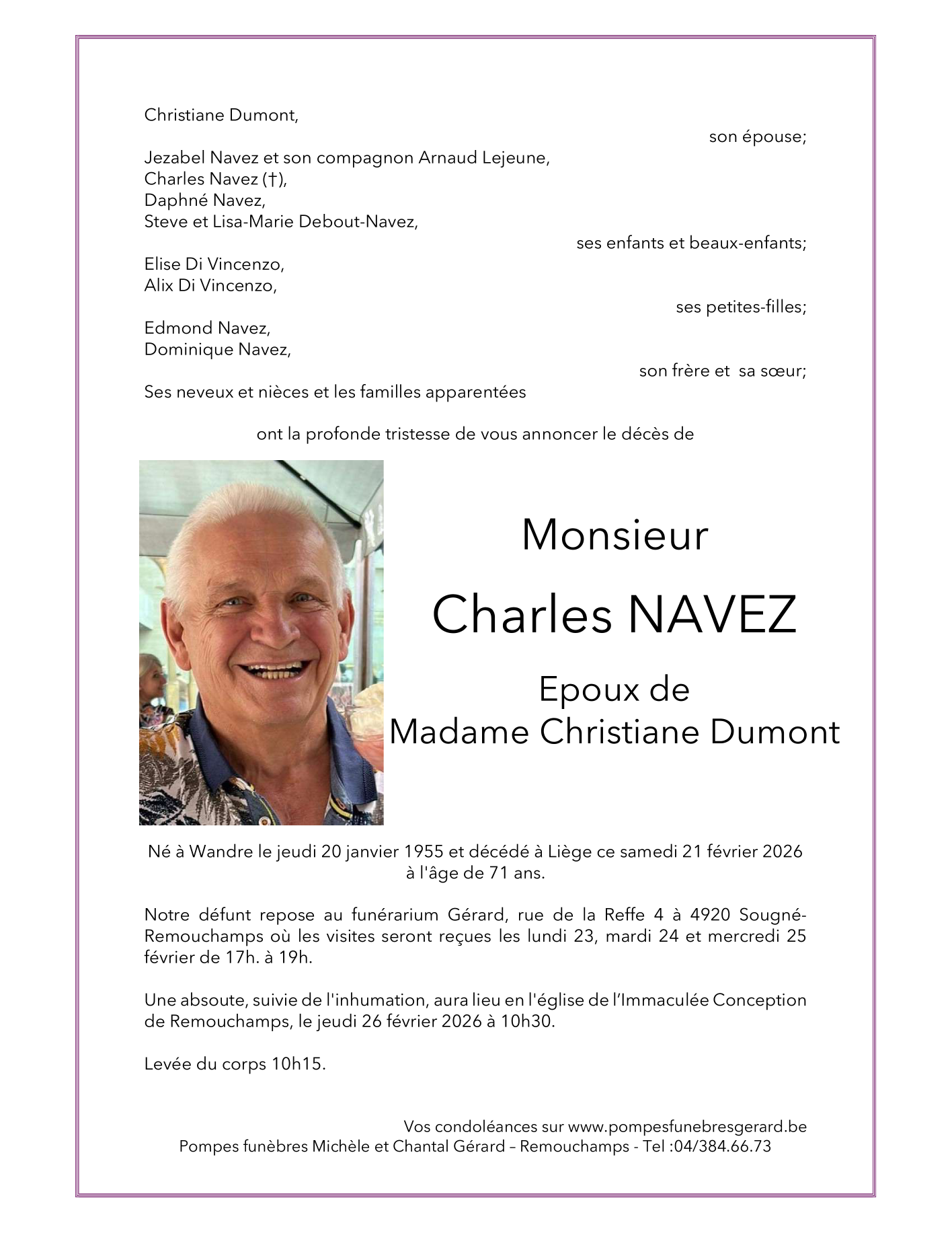 Décédé à Liège (4000) le samedi 21 février 2026 à l'âge de 71 ans