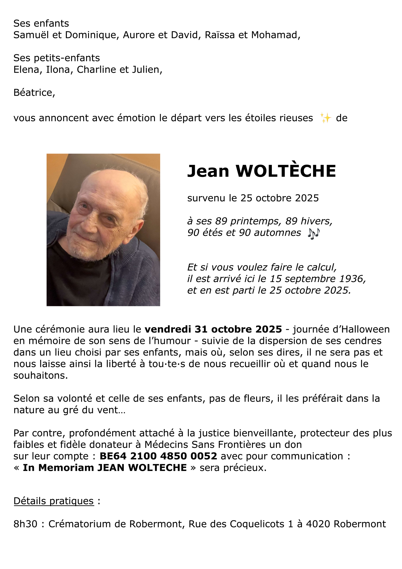 Décédé à Sprimont (4140) le samedi 25 octobre 2025 à l'âge de 89 ans